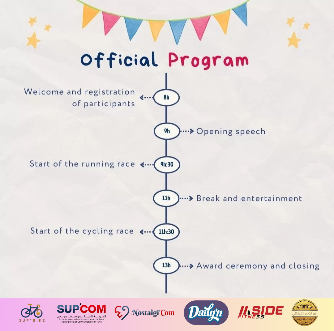 Le Bike'Fest est un événement sportif qui rassemble les passionnés de sport autour d’un défi mêlant énergie, esprit d’équipe et dépassement de soi. Pour sa 7ème édition, qui aura lieu le 9 avril 2026 à la Technopole El Ghazala, l’événement prendra la forme d’un duathlon, combinant course à pied et vélo, où les participants relèveront le défi en binôme. Cette édition est organisée par l’équipe PACTE Nostalgi'Com de SUP'COM, avec l’objectif de créer une journée sportive dynamique, ouverte à tous : étudiants, professionnels et amateurs de sport. De superbes récompenses attendent les équipes gagnantes, pour célébrer la performance et l’esprit d’équipe.